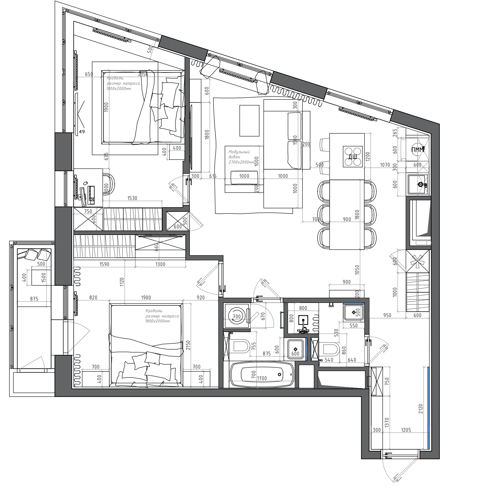 - Planning solutions: we work on options for floor plans in accordance with the TOR and parameters of the project and discuss them together. This step results in perfect floor plans of your apartment